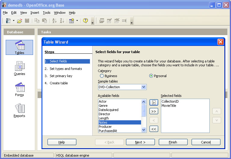 OpenOffice.org provides a new Table Wizard that allows creating database tables
